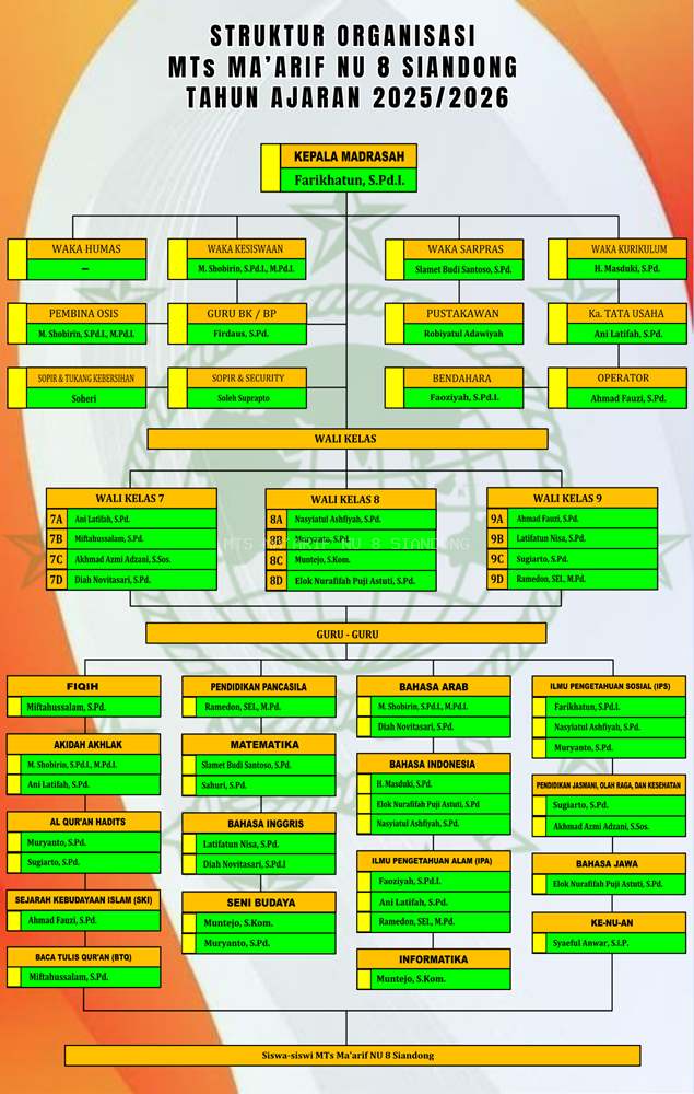 Alhamdulillah, dengan mengucap syukur saya selaku Kepala Madrasah, mengucapkan selamat datang di Website Resmi MTs Ma'arif NU 8 Siandong. Kehadiran website ini merupakan salah satu wujud komitmen kami dalam mengikuti perkembangan teknologi informasi di era digital, serta sebagai sarana informasi, komunikasi, dan publikasi bagi seluruh warga madrasah maupun masyarakat luas.